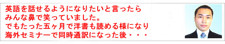 たった4ヶ月で英語が上達して、海外のセミナーに 単独で参加できるようになる。そんなことを井口先生が最初に 言い始めたとき、あ、またかよ。って思ってました。